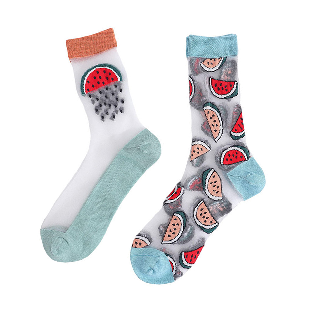 Freshen up your summer wardrobe with our Watermelon Design Transparent Calf-Length Socks! This pack of 2 features lightweight, breathable socks with vibrant watermelon designs, perfect for staying stylish and cool during warm weather.
